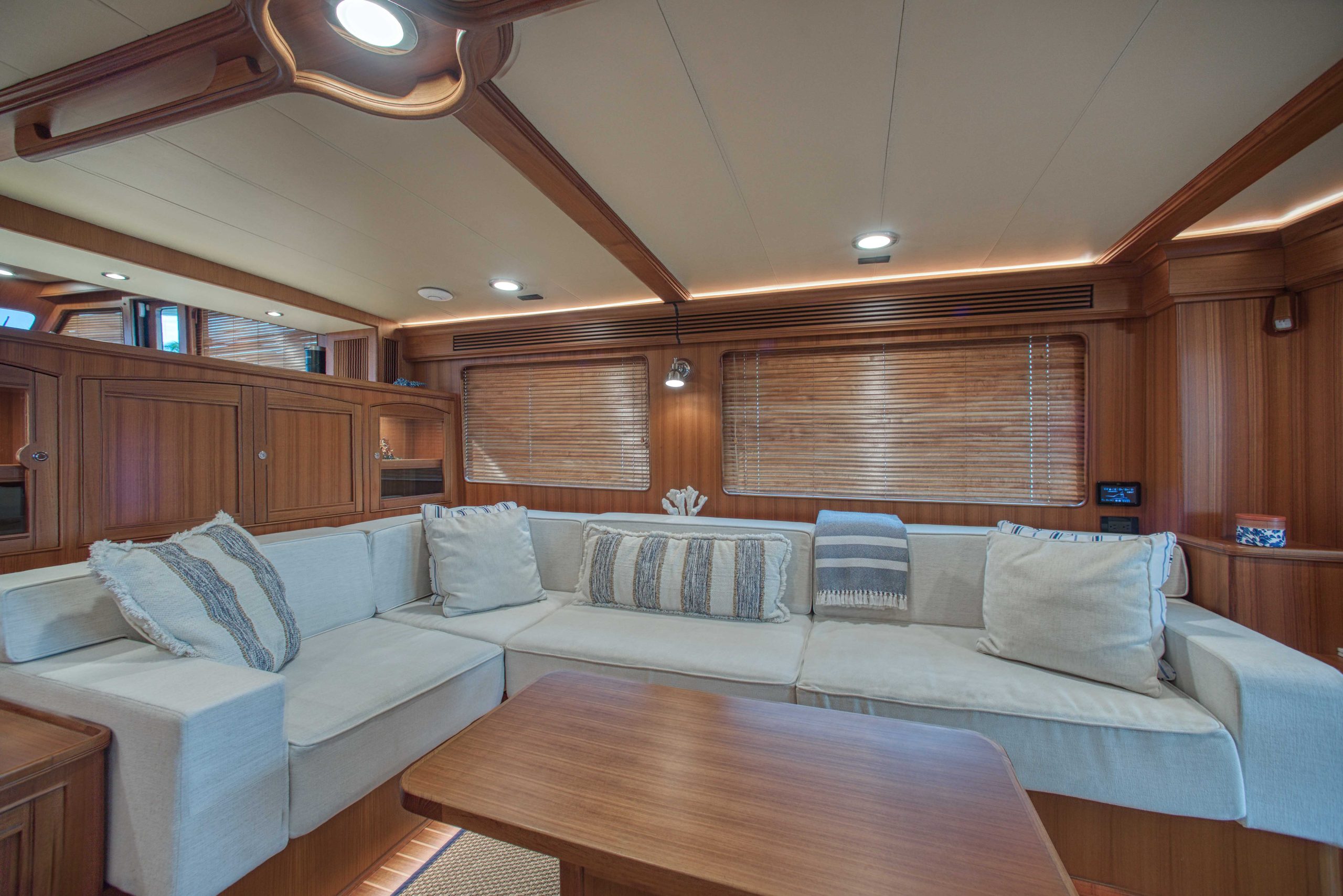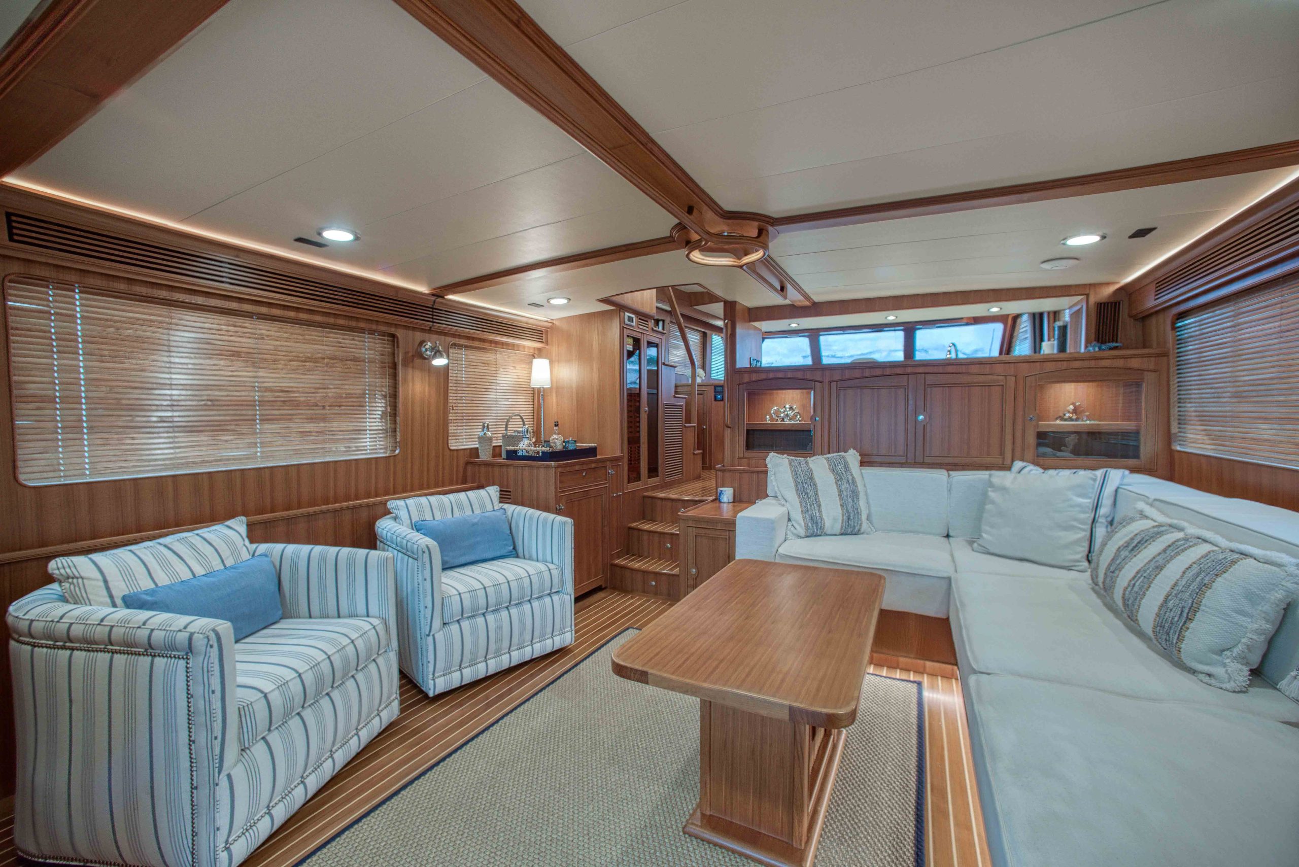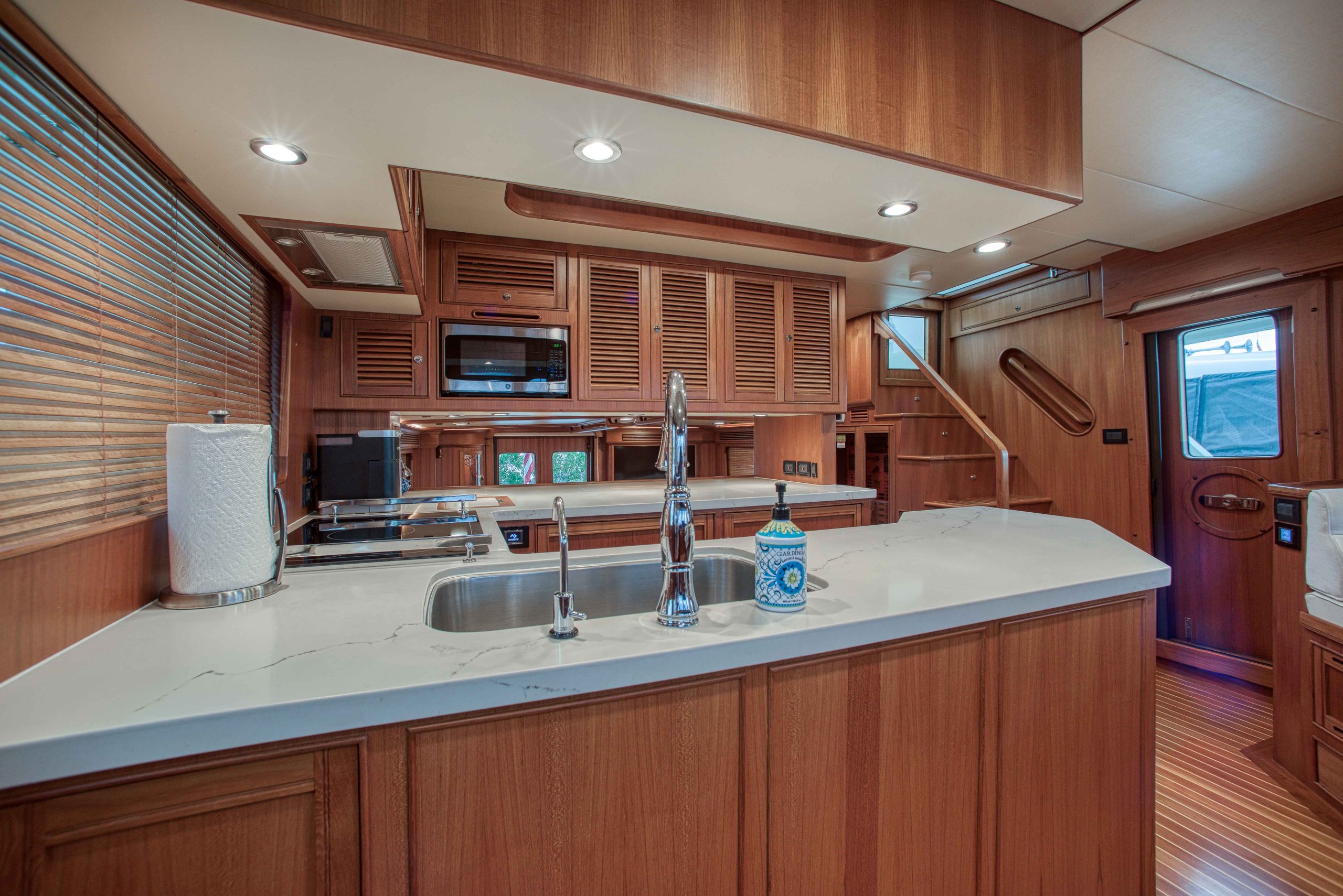 BeamIf you have been waiting for a late model 58E with the largest engines available, new Beach Club, twin heads aft in the master, davit and freedom lift, air-conditioned Flybridge; this is it. The engines were just serviced including the newly required aftercoolers being replaced at 6 years. These CAT C18’s are rated at 1,150 HP each. This is the full beam master with his and hers head aft and large shower in the middle. Dorothy Gale has twin generators, Beach Club / crew area, water maker / spot free combo machine. She loves to cruise at 9 or 19 knots like all the C-18 equipped boats but can cruise at 21-22 knots as well. Her hinged domes and mast allow for easy bridge clearance. Many customers say she is the perfect “Loop Boat”.