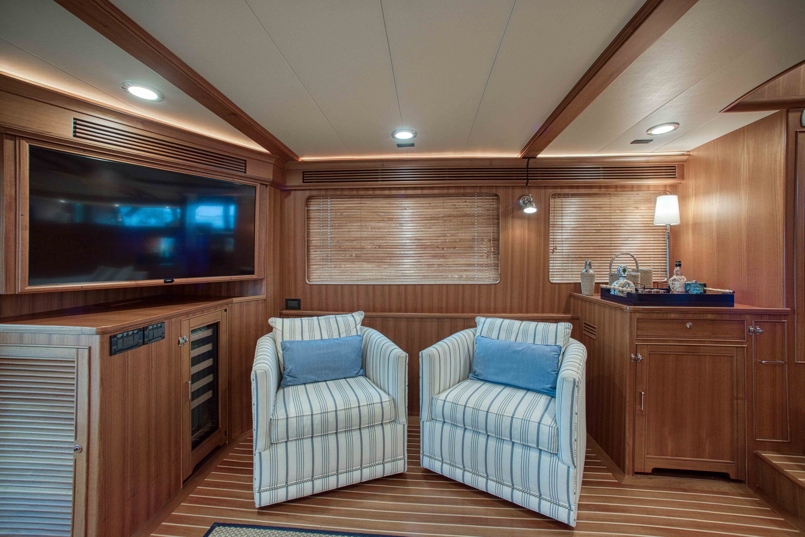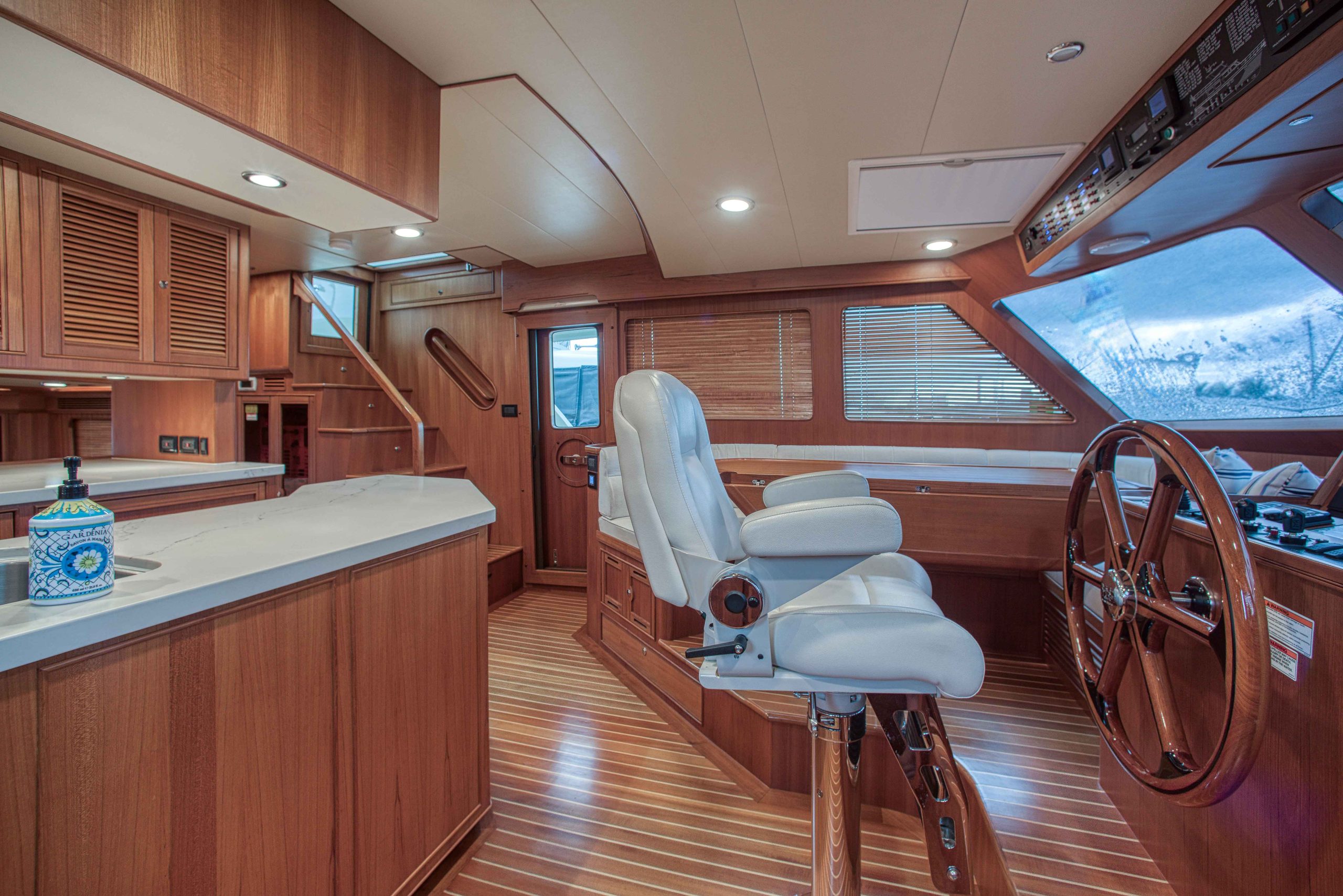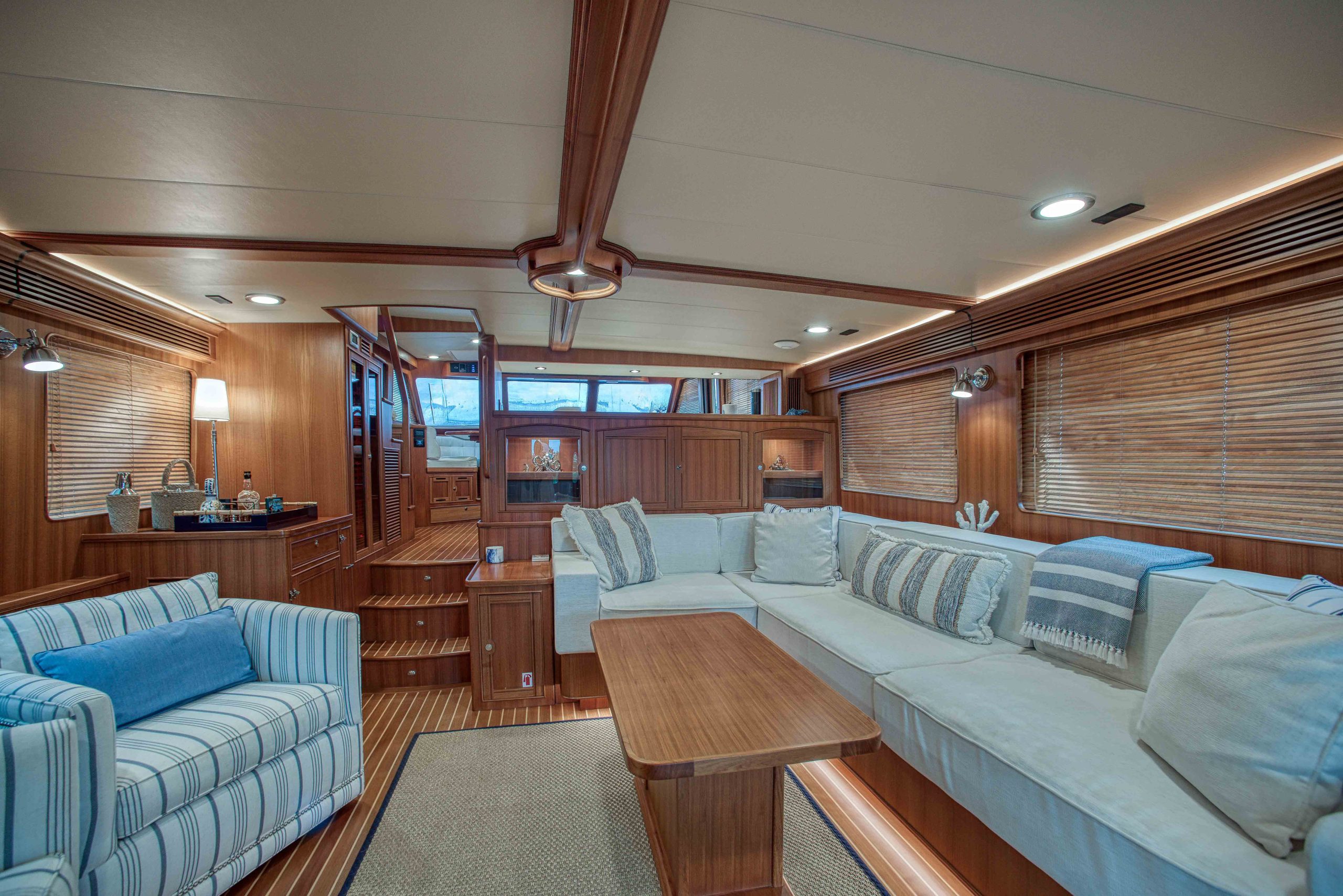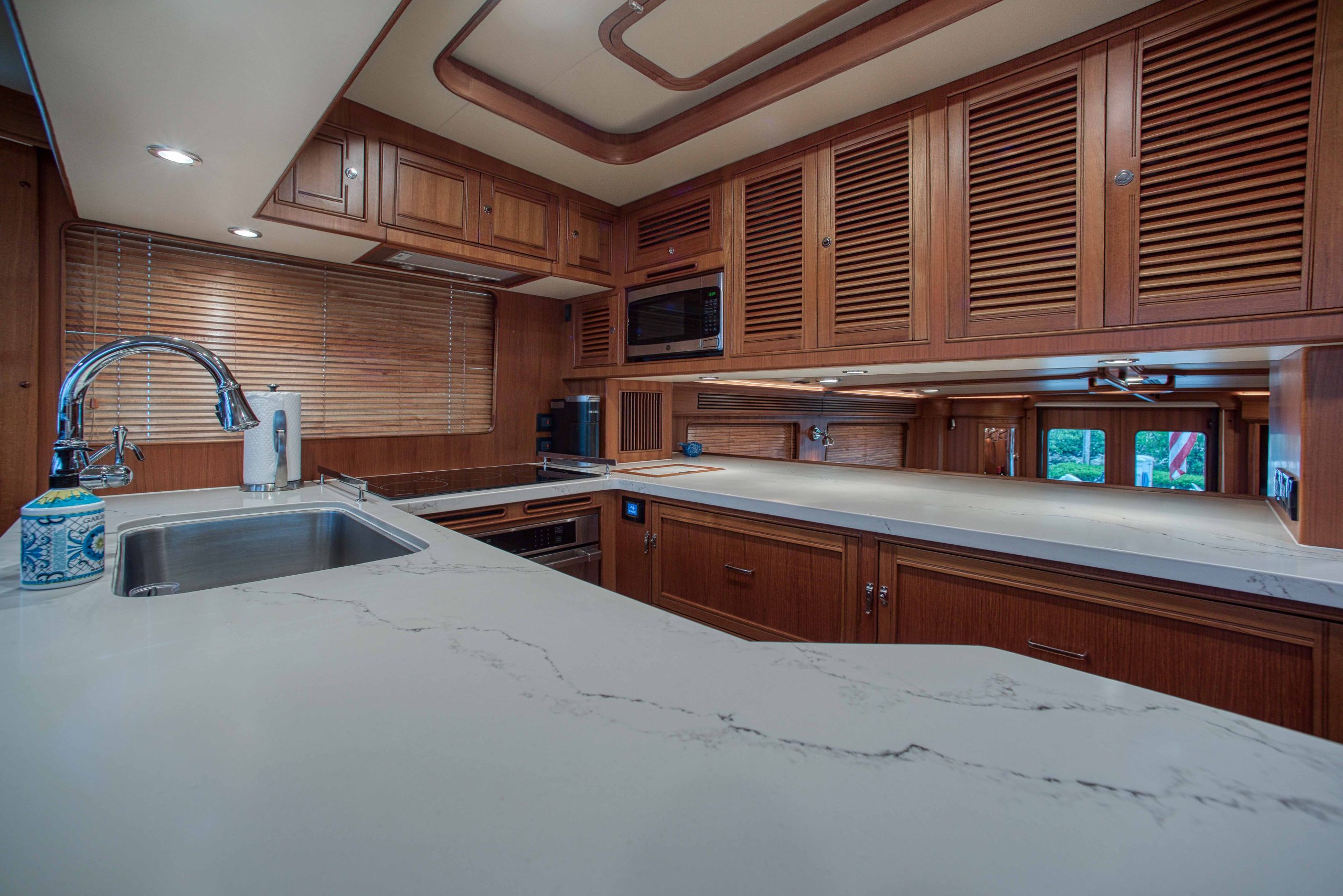 BeamIf you have been waiting for a late model 58E with the largest engines available, new Beach Club, twin heads aft in the master, davit and freedom lift, air-conditioned Flybridge; this is it. The engines were just serviced including the newly required aftercoolers being replaced at 6 years. These CAT C18’s are rated at 1,150 HP each. This is the full beam master with his and hers head aft and large shower in the middle. Dorothy Gale has twin generators, Beach Club / crew area, water maker / spot free combo machine. She loves to cruise at 9 or 19 knots like all the C-18 equipped boats but can cruise at 21-22 knots as well. Her hinged domes and mast allow for easy bridge clearance. Many customers say she is the perfect “Loop Boat”.